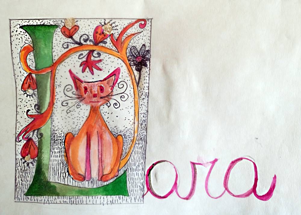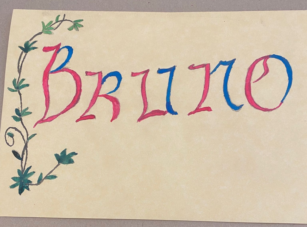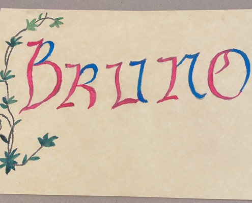 Dopo questi pochi minuti, si può chiedere di scrivere in bella grafia, prima con la matita se necessario, il proprio nome. Dopo aver ripassato con l’inchiostro le lettere, si procede alla decorazione della scrittura con il disegno, la coloritura ad inchiostro ed infine applicando la foglia similoro.