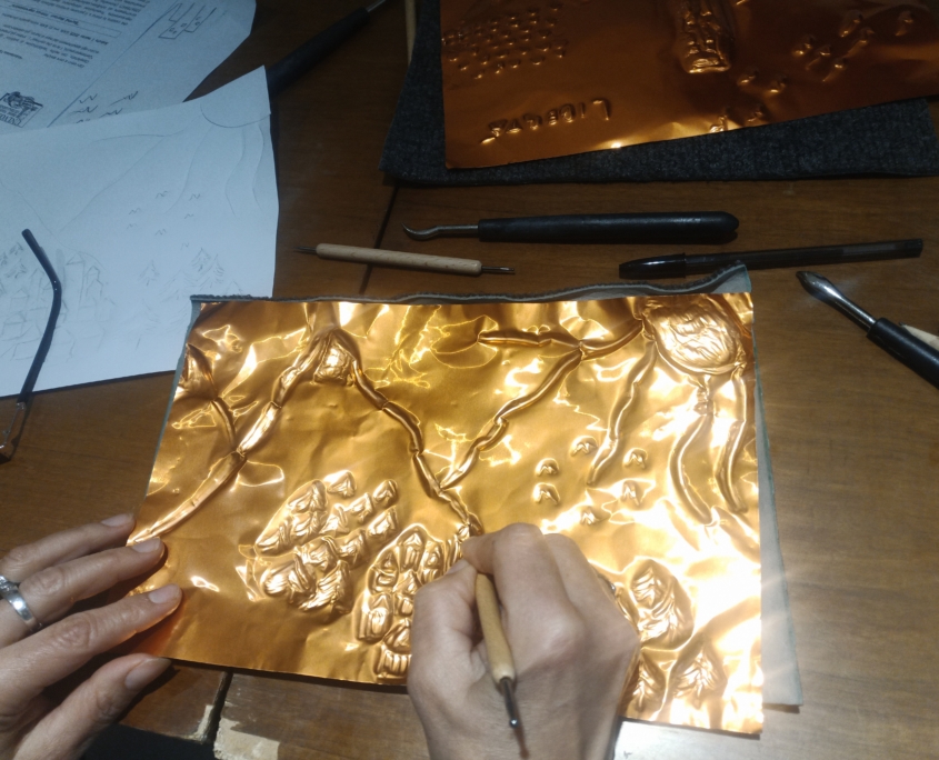 Con i bulini di varie misure procedere ad allargare il contorni dello sbalzo e poi, premendo la superficie con delicatezza per non forare, creare i vari livelli di tridimensionalità. Girare di tanto in tanto la lamina, per avere contezza di come sta venendo il lavoro sul lato in rilievo.