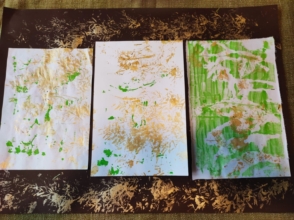 Appoggiare sul colore, prima che si asciughi, gli elementi naturali , ripetendo la composizione progettata.